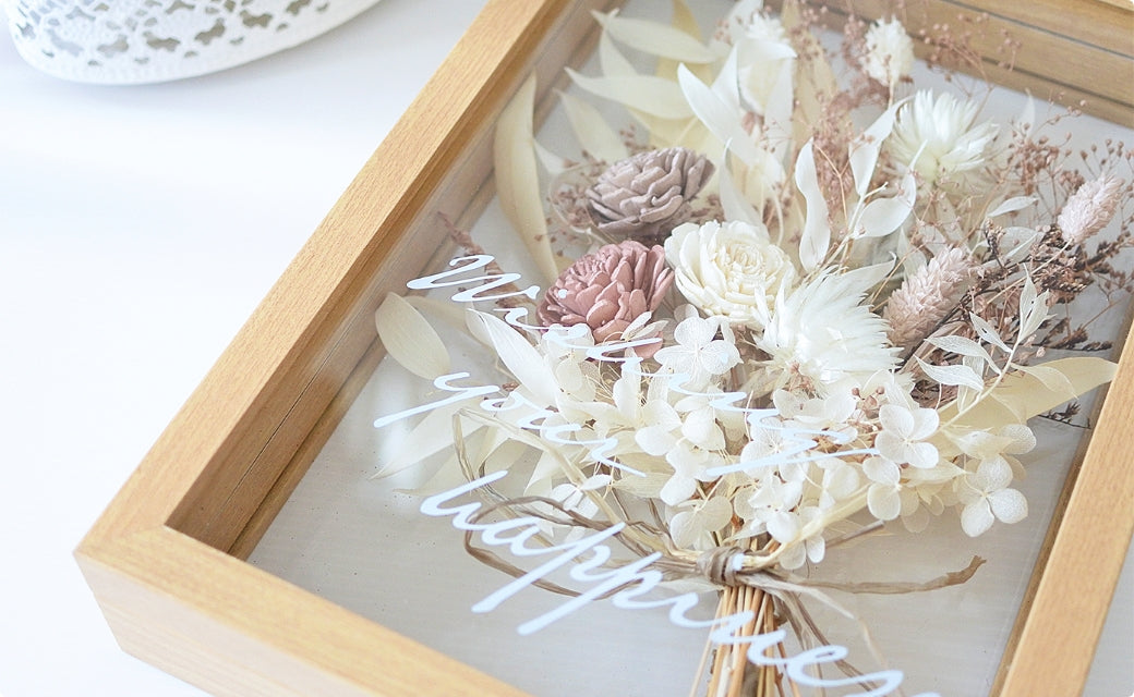 Bloom Gift(ブルームギフト)のウェルカムボードは、メッセージ入りのガラスの額にドライフラワーやプリザーブドフラワーを閉じ込めた花束のようなウェルカムボードです。(価格は15,400円~)